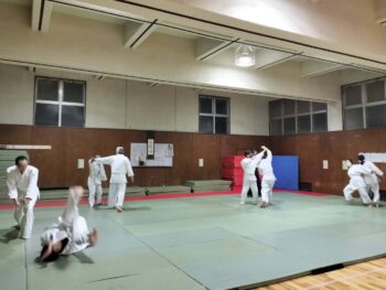 まずはウォーミングアップの第二教、小手返し、四方投げ、そしてここ最近は基本技の最後の仕上げとして取り組んでいる回転投げを。もうだいぶ慣れてきたのが見て取れます。