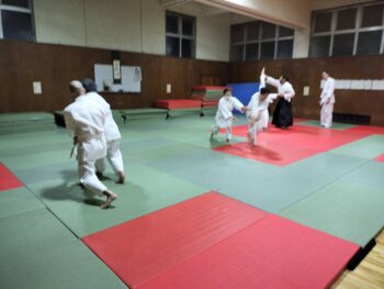後ろ両手首取りは、当道場では昨年から始めた捌きで、まだ数回しかやっていないのですが、全体的なレベルが向上しているのでだいぶスムーズに技を展開できるようになっていると感じられました。今回、後ろ両手首取りは初めての道場生も居たのですが、周りがやっているとその空気感もあってか、それほど手こずることもなくこなしていました。