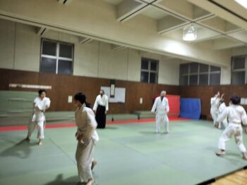基本技の確認の意味合いもあり、正面打ち第一教から。新人は立技にて、それ以外の人は座技にて取り組みました。